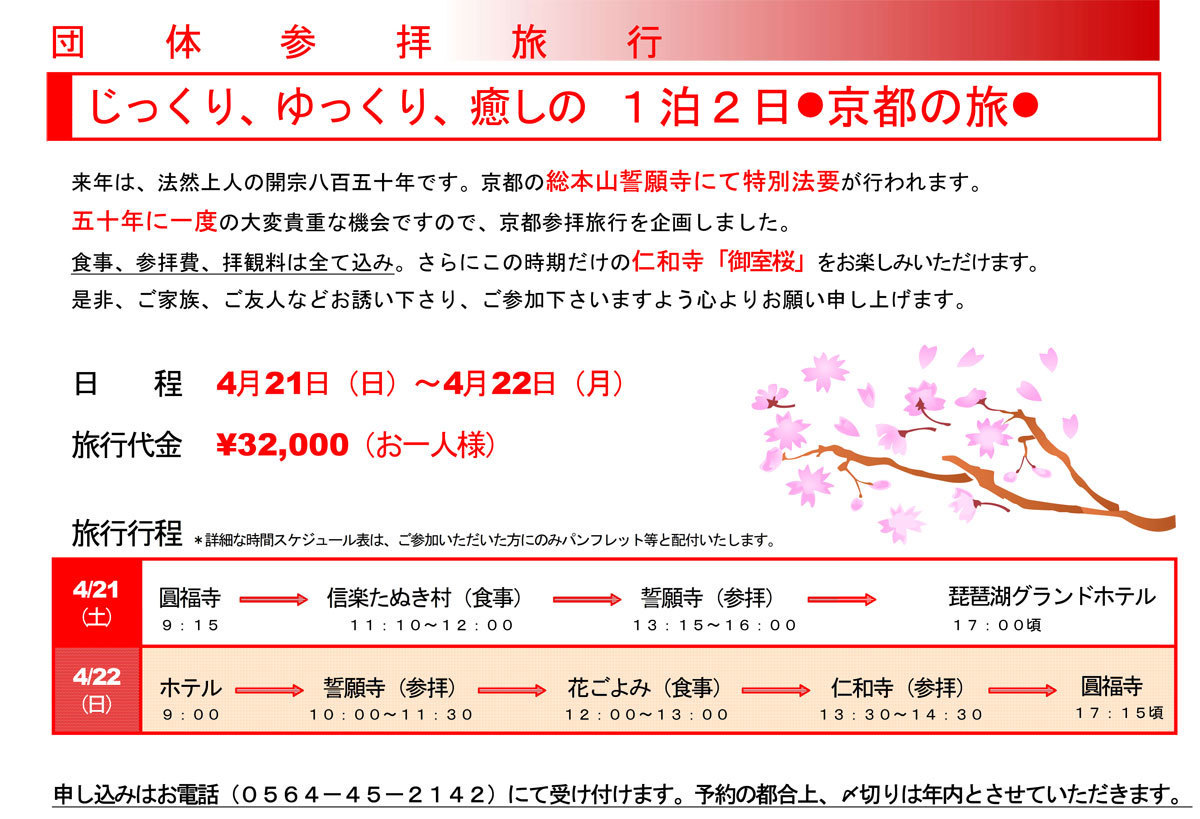 別紙の案内の通り、来年は法然上人の開宗八百五十年です。住職も京都の総本山にて特別なお役を致します。通常、一般のお寺では、それに合わせて檀家さんが住職の晴れ姿を応援しに参るのですが、円福寺はほとんど檀家さんがありません。けれども、せっかくの五十年に一回の機会ですから、京都のお参りの旅行を企画してみました。ご友人などお誘い下さり、ご参加下さいますよう心よりお願い申し上げます。